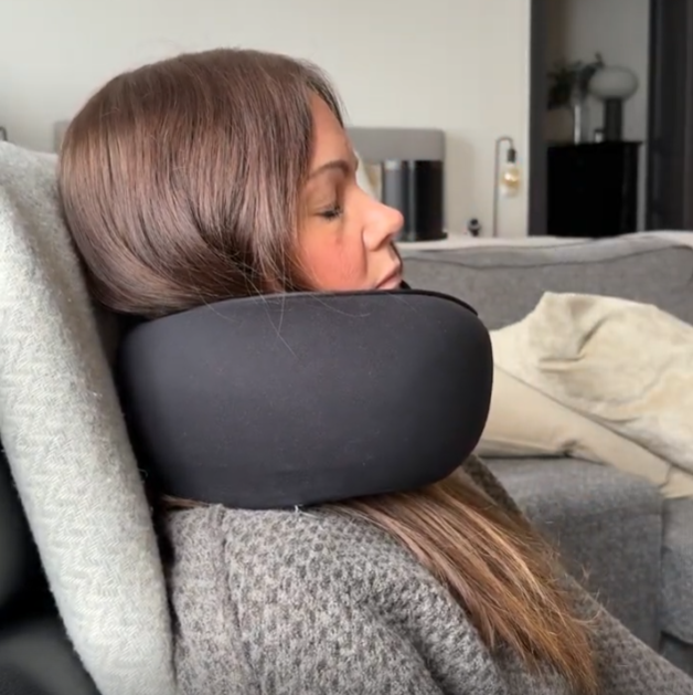 2. Placera kudden bekvämt runt nacken tills du känner att huvud och haka får stöd. Testa en stund och justera läget tills du hittar den perfekta positionen.